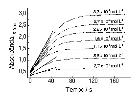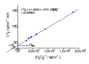 Com os dados obtidos foi possível construir o gráfico do duplo recíproco de Lineweaver-Burk3 (Figura 2), e a partir deste gráfico obter parâmetros cinéticos da enzima peroxidase tais como o valor da constante de Michaelis-Mentem, KM, (1,4 x 10-4 mol L-1) e da velocidade máxima, Vmax, de decomposição do peróxido pela enzima peroxidase extraída de fonte natural ( 0,024 mmol min-1), além das unidades enzimáticas por volume do extrato.