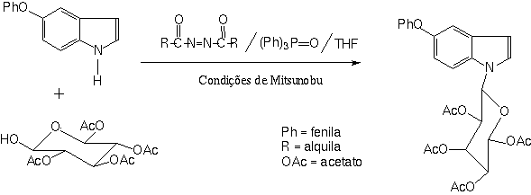 A reação de Mitsunobu é realizada adicionando-se DEAD (dietilazodicarboxilato) e trifenilfosfina em THF seco com agitação magnética à temperatura ambiente. Depois de alguns minutos para a formação do sal fosfônio adiciona-se o indol derivado (benziloxindol ou indol) seguida a adição da glicose.