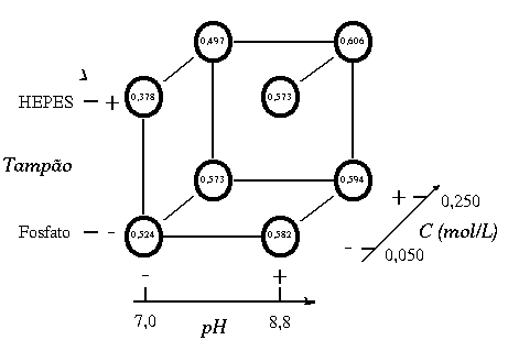 Os ensaios foram feitos logo após o preparo das soluções em água deionizada, medindo a variação de absorbância após 1 minuto de ensaio. No planejamento fatorial 23, foram empregados tampões do ácido 4-(2-hidroxietil)piperazina-1-etano-sulfônico, HEPES (+) e fosfato (-) em pH 8,8 (+) e 7,0 (-) e concentrações 0,25 (+) e 0,05 (-) mol L-1. Em todas as soluções foi utilizado Na2H2EDTA 1,0 10-4 mol L-1. Estas são condições usualmente empregadas na análise de GSH, incluindo os métodos enzimáticos utilizando glutationa peroxidase e glutationa oxidase, devido ao pKa=8,3 do resíduo de cisteína da molécula de GSH. Entretanto, em valores mais altos de pH pode ocorrer a oxidação catalisada por íons OH-, interferindo na análise de GSH.