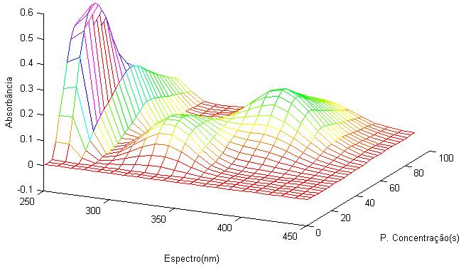 Os dados analisados correspondem à suprefícies de absorbâncias, Figura 2, resultantes de análise por injeção em fluxo na presença de gradiente de pH para os isômeros 2, 3 e 4 hidroxibenzaldeído3. Foram avalidadas amostras dos isômeros puros e em misturas binárias.