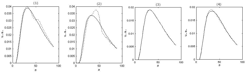 Figura 3 - Perfís de Concentração total resolvidos por ACDM sem o emprego da restrição de sobreposição de posto, (1) e (2), e com a restrição (3) e (4). Gráficos : (1) e (3) - 2-hidroxibenzaldeído; (2) e (4) 3-hidroxibenzaldeído.