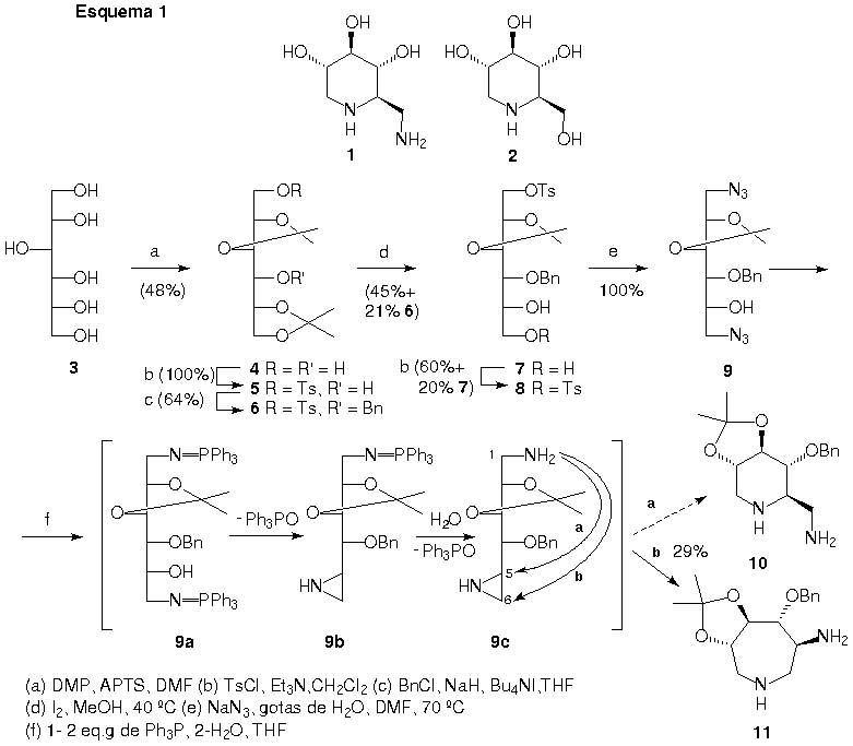 Através de reações de proteção, desproteção seletiva e substituição nucleofílica acessamos a diazida (9), intermediário-chave para a obtenção do composto-alvo (1) (Esquema 1). A etapa crucial, que consiste na reação da diazida (9) com trifenilfosfina, envolve a formação de vários intermediários: redução do grupo azida ao iminofosforano (9a); formação de aziridina (9b) e ciclização intramolecular (9c). Nesta ciclização, a amina formada no carbono 1 pode fazer ataques nucleofílicos nos carbonos 5 ou 6, levando a estruturas cíclicas de seis membros, composto (10), e/ou sete membros, composto (11). Ao final desta reação foi isolada, de uma mistura de compostos polares, uma substância com 29% de rendimento, que foi em seguida submetida a análises espectroscópicas (IV, RMN-1H, RMN-13C, DEPT, gCOSY, HSQC e NOESY) e espectrométrica (EM por inserção direta).