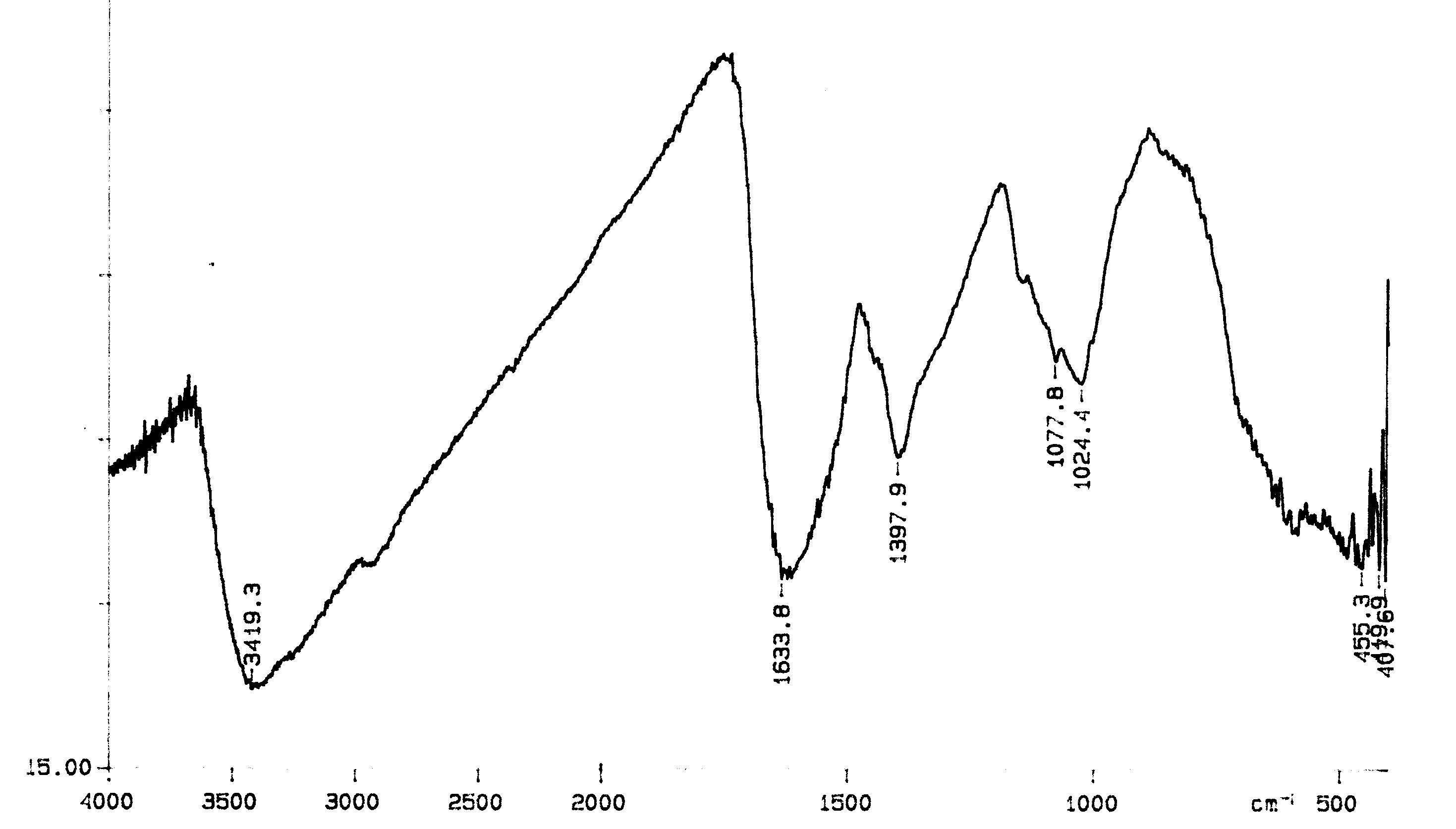 Figura 1- Espectro de infra-vermelho do complexo de ferro formado de íons Fe+3 (FeCl3 6H2O) mais hidrolisado. Relação molar de 1mol de nitrogênio / 1 mol de ferro.