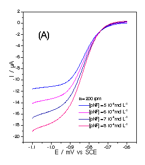 A importância da detecção do 4-nitrofenol sem a interferência do 4-nitrofenilfosfato, permite a utilização do eletrodo em dosagens de fosfatases ácidas e alcalinas1 de grande interesse em análises clínicas e em pesquisas. Os estudos realizados para a determinação eletroquímica de 4-nitrofenol em dosagens destas fosfatase ácidas e alcalinas mostram a interferência do 4-nitrofenilfosfato. Portanto, faz-se necessário a preparação de um eletrodo de carbono vítreo com uma membrana de Nafion a 5% (m/v) para eliminar este interferente. Com o objetivo de verificar a influência da membrana sobre a redução do 4-nitrofenol realizou-se uma investigação cinética.