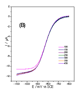Fig.1 Voltamogramas de varredura linear obtidos com eletrodo de carbono vítreo recoberto com Nafion a 5% (m/v) para 4-nitrofenol (Tampão fosfato 0,1 mol L-1 pH7, 10 mV s-1) com eletrodo rotatório. (A) Diferentes concentrações de 4-nitrofenol e (B) diferentes velocidades de rotação [pNF] = 5 10-4 mol L-1.