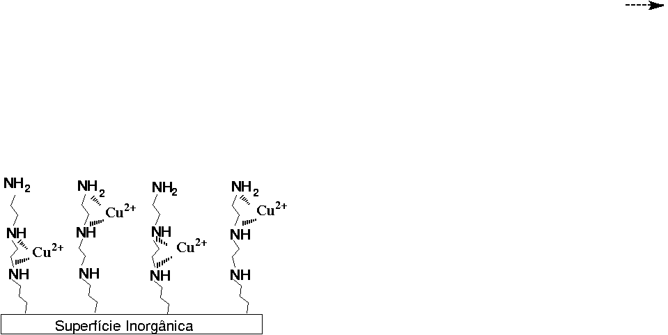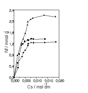 A adsorção foi feita tratando 30,0 mg das matrizes modificadas com 25,0 cm3 de soluções aquosas de sais de cobre em concentrações variando entre 1 x 10-3 a 1 x 10-2 mol dm-3 em sistema agitado mecanicamente a 298 K. Após o equilíbrio, as amostras foram centrifugadas e alíquotas da solução do sobrenadante foram diluídas a 100 cm3 mantendo a concentração de cobre na faixa de 3,0 ppm. A quantidade de metal presente na solução foi determinada por absorção atômica. O número de mol de metal fixo por grama do material (Nf) foi determinado pela equação Nf = (Ni  Ns)/m, onde m é a massa do adsorbente, Ni e Ns são o número de mol do metal antes e após o processo de adsorção, respectivamente.