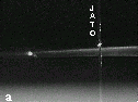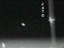 Figura 1:Incidência de laser em jatos de água; a) jato escoando sob ação da gravidade; b) jato produzido a pressão de 18 kgf.cm-2 (nebulosa fora de contraste).
