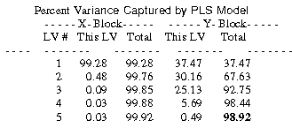 Os resultados mostram que a correção por "msc" fornece resultados melhores do que nos casos em que a mesma não foi feita. Não obstante não haja diferença na variância acumulada no blco X, há um aumento da mesma no bolco Y. O erro final obtido em termos da soma dos quadrados dos erros de previsão é menor quando se aplica "msc". As tabelas a e 2 mostram os resultados obtidos sem e com correção, respectivamente.