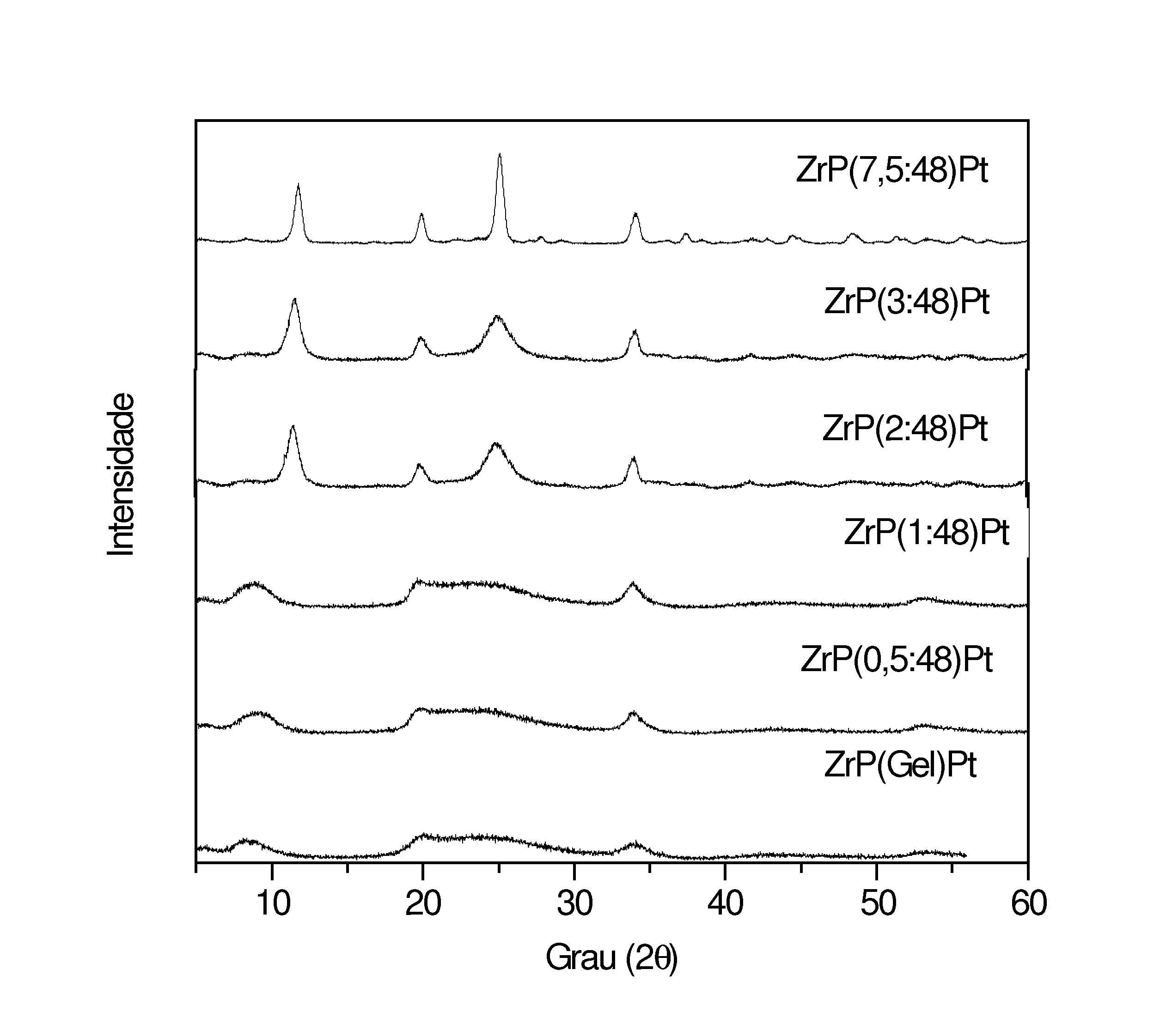Os resultados de análise química indicaram que os fosfatos de zircônio amorfos apresentaram uma relação P/Zr inferior a 2 (relação estequiométrica), enquanto que nos sólidos cristalinos esse valor foi próximo do estequiométrico. No processo de troca com a platina, observou-se que as taxas de platina trocada foram próximas das esperadas experimentalmente(0,5% de Pt). A partir dos difratogramas de raios-X dos fosfatos originais, foi possível observar que o refluxo do gel com soluções de ácido fosfórico com diferentes concentrações, aumenta a cristalinidade destes materiais. A troca de 0,1 meq/g com platina não levou a modificações no padrão de difração das amostras cristalinas, entretanto nos fosfatos amorfos notaramse algumas reflexões indicando um início de organização da estrutura lamelar após a troca H+ / [Pt(NH3)4]2+ (Figura 1).