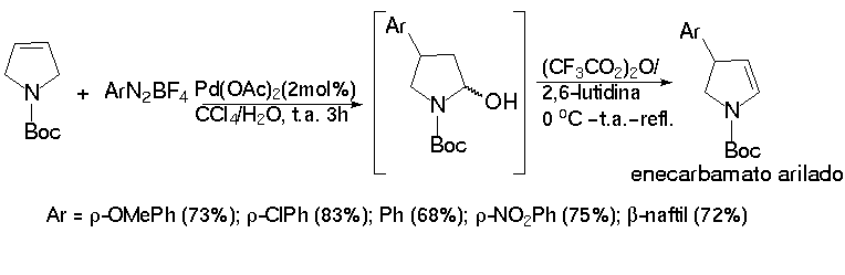 A arilação de Heck de N-Boc-3-pirrolinas com vários sais de diazônio em CCl4/H2O ou CH3CN/H2O e 2 mol% de Pd(OAc)2 forneceu os lactamóis correspondentes, os quais foram convertidos aos enecarbamatos endocíclicos na presença de anidrido trifluoracético/2,6-lutidina em bons rendimentos (68-83%).