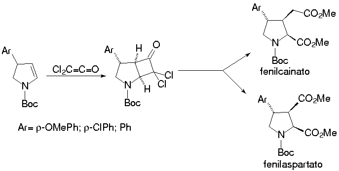 A arilação de Heck dos 4-aril enecarbamatos procedeu suavemente para fornecer as 2,4-aril-3-pirrolinas em bons rendimentos (60%). A cicloadição [2+2] dos enecarbamatos arilados de cinco membros com dicloroceteno procedeu com alta diastereosseletividade permitindo obter a diclorociclobutanona mostrada abaixo como o único cicloaduto detectável em ótimos rendimentos (85-95%). Usando a metodologia descrita anteriormente na literatura3, estas ciclobutanonas foram convertidas para os desejados fenilcainatos e os derivados aspárticos em bons rendimentos (esquema 1).
