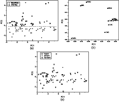 Figura 1: Gráficos dos Scores e Loading onde pode ser visualizada a separação entre as amostras provenientes das duas baías estudadas (a); variáveis que contribuem para estas separações (b) e separação da faixa de 10-50m das demais profundidades (c).