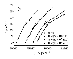Mudanças na condutividade específica, K, de soluções de CTAB, em ausência e presença de TMASi, são apresentadas na Figura 1(a). As curvas, típicas de soluções de aquosas de surfactantes iônicos, apresentam duas porções onde K aumenta linearmente com o aumento da concentração de CTAB, conectadas por uma região de transição, relacionada à formação dos agregados micelares. As porções lineares que sucedem a agregação apresentam inclinações menores do que as que a antecedem, principalmente devido ao fato de uma quantidade considerável de íons de carga oposta a dos monômeros tornar-se parte integrante das micelas formadas. Desta forma, há uma redução no número de espécies disponíveis para o transporte de corrente elétrica, bem como na carga líquida dos agregados micelares.