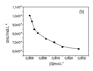 A concentração micelar crítica, cmc, em ausência e presença de TMASi, foi estimada a partir determinação do ponto de inflexão aparente, dado pela intersecção entre as duas porções lineares das curvas de K versus [CTAB]. Em ausência de silicato, o valor de 1,00 x 10-3 mol.L-1 obtido para a cmc do CTAB, encontra-se dentro da faixa de valores relatada na literatura. O perfil de queda da cmc com o aumento da concentração de silicato é apresentado na Figura 1(b). A taxa de queda é pronunciada em baixas concentrações, decrescendo à medida em que a concentração de silício aumenta. A adição de 3,00 x 10-3 mol.L-1 de silício, sob a forma de ânions silicato, promove uma redução de 38% na cmc do CTAB. O decréscimo da cmc de surfactantes iônicos em presença de eletrólitos é típico, uma vez que estes eletrólitos atuam na minimização das forças repulsivas entre as cabeças polares, favorecendo a formação dos agregados micelares.