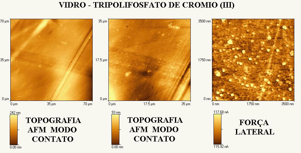 Nas fases líquidas separadas obtidas no sistema Na5P3O10-Cr(NO3)3-H2O, o valor de densidade da fase superior se encontra na faixa de 1,044 e 1,0840 gmL-1 e, da fase inferior, viscosa, se encontra na faixa de 1,6649 e 1,7471 gmL-1. As determinações analíticas neste sistema indicam maior conteúdo de sódio e nitrato nas fases diluídas superiores e em crômio e fosfato nas fases viscosas inferiores, sendo concordantes com os resultados obtidos anteriormente com polifosfato de crômio. Os valores de tensão interfacial observados foram baixos, na faixa de 4,1 mN m-1 a 7,5 mN m-1, indicando que há uma certa facilidade de emulsificação das duas fases líquidas. Quanto ao aspecto morfológico, os produtos de liofilização mostraram muitas características interessantes. As fases inferiores são líquidos viscosos, que facilmente originam fibras ao serem estirados e enrijecem espontaneamente originando vidros de cor verde esmeralda. O aspecto macroscópico do vidro obtido está mostrado na figura 1.a, onde se percebe a formação de cantos vivos e uma superfície lisa. Nas imagens topográficas obtidas por microscopia de força atômica, varrendo-se uma área de 70 x 70mm, o vidro de tripolifosfato de crômio também se apresenta bastante plano,com uma diferença máxima de 242 nm na altura, como mostra a figura 1.b. A permanência do vidro em dessecador por 2 meses leva à formação de uma estrutura altamente porosa, que ao ser observada por microscopia eletrônica de varredura (figura 1.c), mostra poucos domínios planos na amostra e muitos poros com formatos geométricos.