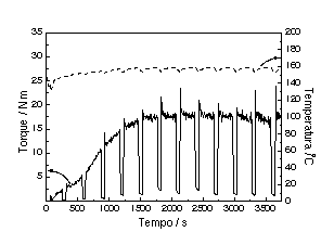 Figura 2. Curva de torque e variação da temperatura durante o processamento da polianilina. As variações bruscas de torque correspondem à interrupção do processamento para retirada da amostra. |