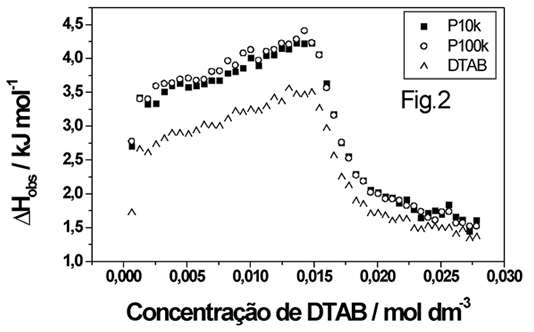 Já para o DTAB(Fig 2), verifica-se uma interação do surfatante com o polímero, mas com energia menor do que para o SDS( 0.6 kJ mol-1). Porém após a concentração de 15 mmol dm-3 (CAC), cessa-se a interação polímero-surfatante. Podemos concluir que esta interação é favorecida entropicamente, dependente da natureza iônica do surfatante e influenciada pelo contra íon do mesmo. Além disto a curva calorímetrica possibilitou a proposição de um detalhado mecanismo de interação.