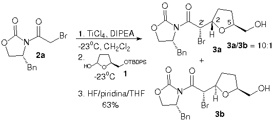Inicialmente, examinamos o acoplamento entre o enolato de titânio derivado da oxazolidinona bromoacetilada 2a e o lactol 1, derivado do ácido (S)-glutâmico.7 O enolato de titânio da oxazolidinona 2a foi gerado à 23oC após adição de TiCl4 e DIPEA. O acoplamento com lactol 1, através do íon oxocarbênio, ocorreu também à -23oC, gerando após desproteção da hidroxila com HF/piridina/THF, uma mistura 10:1 de apenas 2 dos 4 possíveis diastereoisômeros 3a e 3b (determinada por 1H-RMN) em 63% de rendimento (Esquema 1). O diastereoisômero majoritário foi isolado através de coluna cromatográfica e sua estereoquímica absoluta foi determinada por análise de difração de raio-X. A estereoquímica absoluta de 3b foi proposta através da constante de acoplamento J2,2 e correlações químicas.