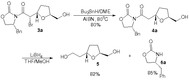 Desalogenação redutiva de 3a na presença de Bu3SnH/AIBN/DME forneceu o produto 4a em 80% de rendimento. Remoção do auxiliar quiral de 4a, gerou o diol 5 em 82% de rendimento (Esquema 2).