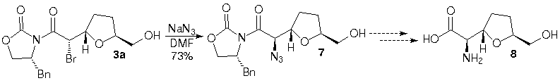 A importância sintética de a-amino ácidos enantiomericamente puros nos levou a aplicar a metodologia desenvolvida por Evans e col.8 para promover a substituição do átomo de bromo de 3a pelo grupo azida na presença de NaN3 em DMF. Esta reação ocorre com inversão total de configuração (Esquema 3).