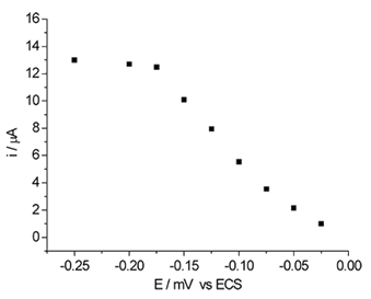 Foram então realizados estudos eletrocatalícos com o material obtido na eletrorredução de oxigênio. Para determinar o potencial exato onde inicia-se o processo redox foi utilizada a cronoamperometria. Na Figura 1 são apresentados os dados obtidos através de cronoamperometria para o material SiTiSb/CoTmPyP. Observa-se que a redução do oxigênio inicia-se em aproximadamente 50 mV e atinge um valor constante em aproximadamente a 180 mV. Este potencial é mais positivo que o encontrado para a redução do oxigênio no grafite, que ocorre em aproximadamente -450 mV[2].