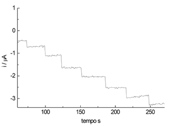 O potencial de trabalho foi fixado em 180 mV para os estudos de cronoamperometria. Verificou-se então a performance do eletrodo na redução de oxigênio em solução. O cronoamperograma de corrente em função do tempo é apresentado na Figura 2, sendo que os desníveis de corrente correspondem a adições sucessivas de oxigênio na solução.