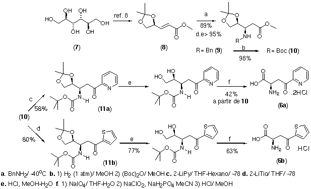 Este estudo parte do D-manitol (7) como matéria-prima e usa a adição estereosseletiva de benzilamina ao enoato 8, para formar o b-aminoéster syn5 (9). Após investigações prévias6, a função éster de 10 foi visualizada como precursora da porção oxoaril através da adição nucleofílica de 2-lítio-piridina (2-LiPy) e 2-lítio-tiofeno (2-LiTio). O grupo acetonídeo das b-aminocetonas 11a e 11b foi utilizado como precursor do grupo carboxila7 dos aminoácidos 6a,b por hidrólise, clivagem oxidativa e oxidação do aldeído resultante.