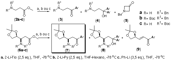 As adições estão descritas no abaixo. Embora 2a e 6a sejam bons complexantes do lítio, conduziram à lactama 5 e às enonas 9. Para os não-complexantes 2b e 6b, o curso reacional dependeu do aril-lítio. Para 2c e 6c, as cetonas dos tipos 3c e 7c foram obtidas majoritariamente, indicando que estes b-aminoésteres promovem uma estabilização eficiente do intermediário alcóxido.