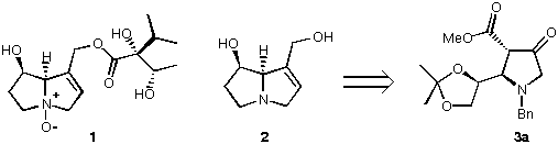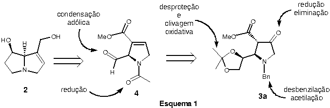 Método: A partir da adição sin-estereosseletiva de benzilamina a um enoato derivado do manitol, seguido de N-alquilação do aduto formado com BrCH2CO2Et e reação de Dieckmann regiosseletiva, preparamos o b-cetoéster 3a.3 Estudos visando a transformação de 3a na (+)-retronecina 2, vem sendo conduzidos baseados na análise retrossintética mostrada no esquema 1.