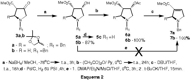 A redução de 3b com NaBH4 forneceu o b-hidroxiéster 5b com razoável estereodsseletividade (cis/trans - 4/1), resultado de uma indução do tipo 1,2 controlada pelo grupo éster, embora este dado não tenha relevância para os nossos propósitos neste trabalho. Tentativas de transformação de 5b em 7b via mesilação da hidroxila seguido de eliminação foram infrutíferas. Entretanto, a acetilação de 5b conduziu ao b-hidroxiéster acetilado 6b, o qual foi posteriormente transformado no enoato 7b por reação com DBU (rendimentos quantitativos para ambas etapas). A redução de 3a nas mesmas condições de 3b, conduziu ao b-hidroxiéster quiral 5a o qual foi desbenzilado levando ao produto 5c. Paralelamente 5a foi acetilado fornecendo o produto 6a. Até o momento não foi possível o assinalamento inanbígüo da esteroquímica do carbono carbinólico em 5a. A reação de eliminação em 5a ou 6a deverá conduzir a 7a (ou seu derivado N-acetilado), um intermediário que possui o arcabouço estrutural do anel B da retronecina.