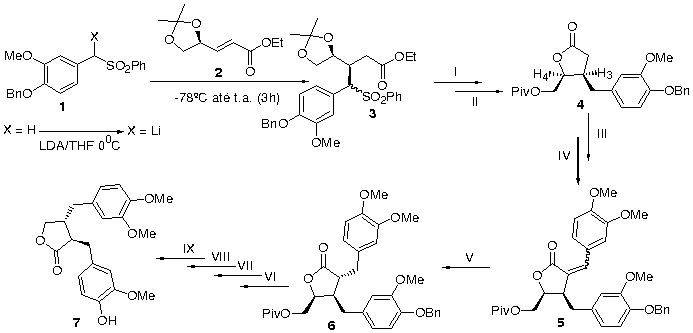 Método: Estudos metodológicos foram desenvolvidos por nosso grupo em adições conjugadas de nucleófilos a enoatos quirais g-oxigenados derivados do D-(+)-Manitol.3 O uso de sulfonas como carreadoras de unidades alílicas, prenílicas e benzílicas foi investigado, conduzindo a produtos de adição tanto sin quanto anti (ed>90%).4 Para a obtenção de 7, utilizaremos a sulfona 1, derivada da Vanilina benzilada, como carreadora da unidade C6-C1. A adição conjugada ao enoato 2, deverá levar a formação do aduto sin 3, com a configuração idêntica a do carbono 2 da lignana alvo.