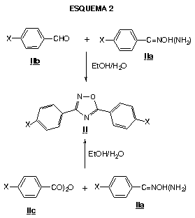 Inicialmente tentamos a síntese de derivados isoxazólicos 3,5-bis-para-fenilsubstituidos I (Esquema 1) a partir da condensação clássica entre o éster benzóico Ia e a acetofenona Ib correspondentes em meio etóxido de sódio/etanol seguida da ciclização por hidroxilamina, no entanto a necessária presença de grupos eletrón-retiradores em para impediu a condensação. Este efeito eletrônico também foi responsável pelo insucesso de outro método de ciclização a partir da condensação entre a oxima da acetofenona para-substituida Ic e o éster benzóico correspondente Ia com n-butil-lítio em THF anidro. Partimos então para a síntese dos 1,2,4-oxadiazóis propostos.