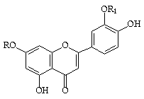 As substâncias 2, 3, 4a e 4b foram identificadas através de dados de RMN 1H e 13C (PND, DEPT), EM e comparação com dados da literatura. A posição do açúcar em 4a e 4b foi determinada por análise de espectros no UV com adição de reagentes diagnósticos de deslocamentos. A substância 1 teve sua estrutura determinada por experimentos de RMN (uni e bidimensionais), EM, UV e DC. O FABMS positivo apresentou o íon quasi-molecular em m/z= 593, e a fórmula molecular C30H24O13 foi confirmada pelos resultados de análise elementar. A configuração relativa foi determinada por experimentos de nOe diff e configuração absoluta obtida através do sinal do Efeito Cotton obtido pela curva de DC comparando com dados da literatura4.