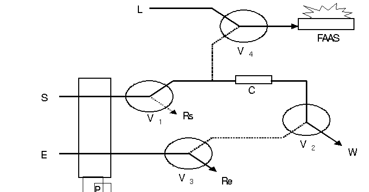 O sistema está representado na figura em anexo. A válvula solenóide V1 é inicialmente acionada e as outras válvulas, V2, V3 e V4 são mantidas desligadas. Assim, a solução-amostra (S) passa através da minicoluna (C) a 2,25 mL min-1com o auxílio de uma bomba peristáltica (P), enquanto água (L) é aspirada continuamente para o nebulizador de um espectrofotômetro (FAAS). Os íons chumbo (II) são retidos na minicoluna e o resíduo da solução é descartado (W). Após 2 minutos, a válvula V1 é desligada e as outras são acionadas. Então, o eluente (E), que flui a 5,00 mL min-1, retira o analito da coluna e o leva diretamente ao espectrofotômetro. Nas posições de pré-concentração e eluição, o eluente (Re) e a amostra (Rs), respectivemente, retornam aos frascos originais, evitando-se, assim, o desperdício de reagentes. A freqüência de amostras foi de 26 h-1.
