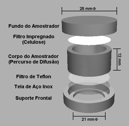 O monitor passivo desenvolvido (configuração sugerida por Ferm & Svanberg[1]) constitui-se de um corpo cilíndrico de polietileno de 12 mm de altura e 20 mm de diâmetro, tela de aço inox (0,08 x 0,125 mm) na entrada de ar, seguida por um filtro de teflon. Após o caminho de difusão (12 mm) encontra-se um filtro (celulose) impregnado com um reagente adequado destinado a fixar o NO2 que difunde através do espaço do corpo do amostrador (Figura 1).