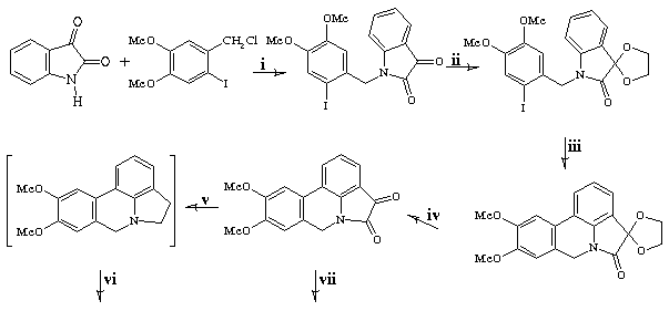 A N-benzilação da isatina 4 através da reação com cloreto de 2-iodo-4,5-dimetoxibenzila 5, na presença de carbonato de potássio e iodeto de potássio em DMF,7 forneceu a respectiva N-benzilisatina 6 em 90-92% de rendimento. A proteção da carbonila cetônica de 6, através da reação com etilenoglicol na presença de quantidade catalítica de ácido p-toluenossulfônica, levou ao cetal 7 em altos rendimentos. Este, através do aquecimento na presença de 10% molar de acetato de paládio II, 1 equivalente de Bu4NBr e 5 equivalentes de KOAc, em DMF; foi convertido no produto de ciclização 8 em 81-87% de rendimento.