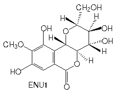 O espectro de RMN1H de ENU-1 em DMSO-d6 apresentou um sinal simples de metoxila a d 3,770 e um sinal simples de um próton aromático a d 6,998. O espectro apresentou ainda sinais relativos a prótons hidroxílicos aromáticos a d 9,752 e a d 8,443 e alifáticos a d 5,641, d 5,426 e d 4,910 comuns para prótons hidroxílicos quando o espectro é registrado em DMSO-d6. O espectro de RMN13C de ENU-1 mostrou um sinal de carboxila a d 163,400 e o espectro de DEPT-135o revelou a existência de um grupo metileno a d 61.110 característico de -CH2OH de açúcares. O espectro na região do infra-vermelho usando-se KBr como solvente indicou a presença de grupo hidroxila e de um grupo carboxila na molécula provavelmente relativo a um éster ou lactona. A análise de todos os dados espectrais de ressonância uni e bidimensionais (1H, 13C , DEPT 90o e 135o, Cosy, Correlação C-H1,2, Noesy e J-resolvido) e infra-vermelho do composto ENU-1 e comparação com dados existentes na literatura4 permitiu-nos identificar ENU-1 como a bergenina. A bergenina está relatada na literatura por sua atividade antiinflamatória e já foi descrita nesta família na espécie Humiria balsamifera5.