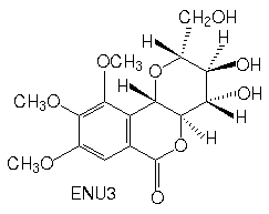 O espectro de RMN1H de ENU-3 mostrou três sinais simples correspondentes a três grupos metoxilas d 3,909; d 3,890 e d 3,870 duas das quais estão mais desprotegidas d 3.909, d 3.890. O espectro mostrou ainda um sinal simples de próton aromático a d 7.441. O espectro de carbono-13 e DEPT 135o e 90o mostraram-se similares aos de ENU-1 diferindo apenas na presença de sinais para mais dois grupos metoxilas. O espectro na região do infra-vermelho usando-se KBr como solvente indicou a presença de grupo hidroxila e grupo carboxila na molécula provavelmente de um éster ou uma lactona . A análise dos dados espectrais permitiu-nos propor para ENU-3 a estrutura da 8,10-dimetoxibergenina ainda não descrita na literatura. A confirmação de ENU-3 como a 8,10-dimetoxibergenina foi obtida por metilação da bergenina com sulfato de dimetila e com diazometano.