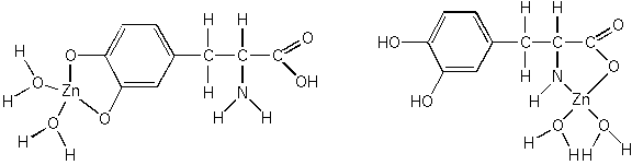 A complexação da L-Dopa com o zinco é provavelmente mais estável quando a complexação ocorre com o grupo fenólico devido à menor energia estérica e menores tensões entre as ligações.