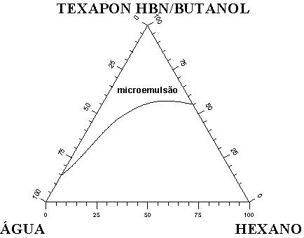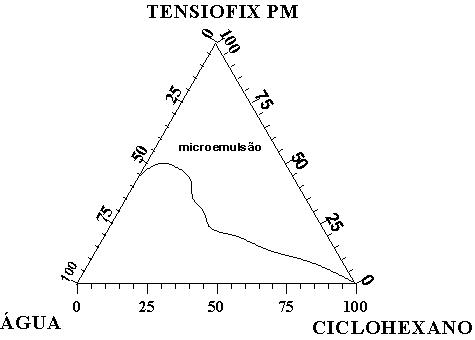 Selecionados os tensoativos e a fase orgânica, partiu-se para a construção dos diagramas de fases (figura 01), através de micro-titulações mássicas, a 28 ºC, a fim de se determinar as regiões de microemulsão. Neste caso, buscaram-se domínios de microemulsão A/O que fossem bem representativos nos respectivos diagramas e mais favoráveis à formação do organogel.