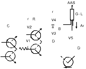 Figura 1. Diagrama do sistema FI. A: amostra; C: carregador (HNO3 0,2%); R: redutor (NaBH4); L: alça de amostragem; B: reator (15 cm); D: descarte: r: reciclo de solução; a: confluência; V: válvulas solenóides; Ar: argônio: G-L: separador gás-líquido; AAS: espectrômetro de absorção atômica.