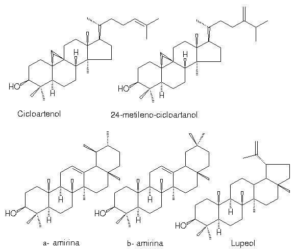 CONCLUSÃO: A fração triterpênica (F5) é constituída de: cicloartenol, 24-metileno-cicloartanol, a-amirina, b-amirina e lupeol. Pela integração dos hidrogênios carbinólicos em relação aos hidrogênios em anéis ciclopropânicos e a associação com a análise dos dados de RMN 13C constatou-se que o cicloartenol é o constituinte majoritário.