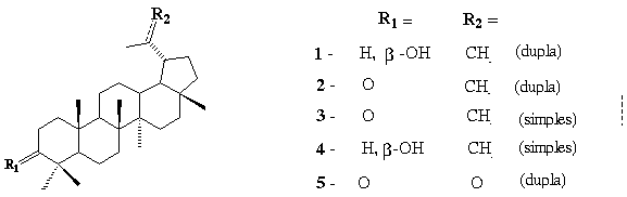 A torta resultante da hidrodestilação foi extraída com hexano, seguida por etanol. Cromatografia sobre gel de sílica, do extrato hexânico obtido, forneceu significativa quantidade de triterpenos, os quais foram identificados como lupeol, 1, e principalmente sua cetona correspondente, 2.