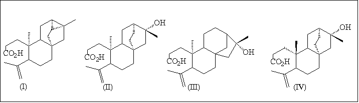 A substância II, de maior Rf dentre II-IV, foi caracterizada como álcool terciário, assim como as duas outras, através dos espectros no infravermelho e RMN 13C (carbono não hidrogenado em ~72,0 ppm). Comparação com dados espectrométricos de I, assim como de outros diterpenos carbinólicos com esqueleto atisano, da literatura, permitiu a proposição da estrutura II. O mesmo procedimento, desta feita por comparação com dados de diterpenos com esqueleto caurânico hidroxilados na posição 16 permitiram a identificação de III. A estrutura IV foi proposta como um epímero de II no carbono-10 em virtude da semelhança dos dados de RMN, exceto para a multiplicidade e deslocamento químico dos hidrogênios a à carbonila.