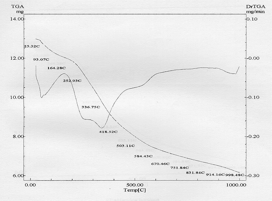 Para ácidos húmicos é comum utilizar a razão da perda de massa versus temperatura (curva TG) onde se observa dois picos principais. O primeiro em baixa temperatura (cerca de 280 oC) e o outro em temperatura mais elevada (> 400 oC). Ocorre primeiramente a eliminação de grupos funcionais e decomposição dos núcleos aromáticos em temperatura superior .