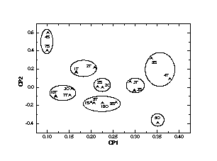 Considerando-se que os grupos funcionais e cadeias alifáticas decompõem-se em torno de 300 oC e que os núcleos aromáticos decompõem-se em temperaturas superiores a 400 oC, conclui-se que os AH das amostras finais apresentam estruturas mais complexas do que amostras menos maturadas. Pelo método das CP, observa-se a separação do conjunto original de dados, após o auto-escalonamento, em oito grupos.
