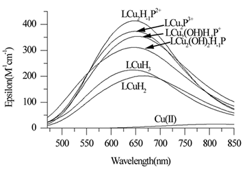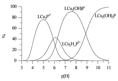 As constantes de estabilidade dos complexos de BMXD-Cu(II) e BMXD-Cu2(II)-glicilglicina foram determinadas por titulações espectrofotométricas, em uma faixa de p[H] compreendida entre 3.0 e 11.0. Os resultados obtidos estão em concordância com os potenciométricos anteriormente obtidos. Os espectros eletrônicos e a curva da distribuição das espécies para o sistema ternário com as diferentes espécies de BMXD-Cu2(II)-glicilglicina estão representadas na Figura 1. A espécie mono hidróxida forma-se em p[H] neutro, a mesma é esperada ser ativa na hidrólise, estudos cinéticos comprovarão estas suposições.