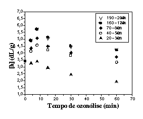 Resultados e Discussão: A Figura 1 apresenta os valores de [h] para filmes de espessura entre 20 e 200 mm em função do tempo de ozonólise. As curvas referentes a espessura superior a 40 mm apresentam comportamento semelhante ao observado para 130-140 mm, nas quais constatou-se um aumento inicial de [h], com 8 minutos de reação, e um posterior decréscimo, para tempos superiores3. Já para filmes de BN com espessura menor do que 30 mm só foi observada diminuição de [h]. O aumento de viscosidade e a diminuição indicam, respectivamente, formação de ligação cruzada e cisão de cadeia, ambos previstos pelo mecanismo de Criegge4. Estas diferenças sugerem que a ozonólise varia com a espessura e que a penetração do ozônio é muito maior do que a indicada na literatura2.