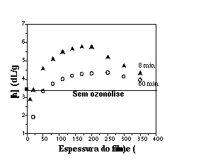 Figura 2 Variação de [h] de BN submetida à ozonólise em função da espessura do filme. Fluxo: 15 mL/min. Temperatura 28ºC.A Figura 2 apresenta a variação de [h] observada com 8 e 60 minutos de ozonólise em função da espessura do filme de BN. O fato de [h]8min aumentar até espessura de 170 mm indica que, com este tempo de reação, esta é a profundidade de penetração do ozônio. Com 60 minutos o ozônio consegue penetrar um pouco mais, até 250 mm. A partir daí a formação de produtos com ligação cruzada impede a penetração e a borracha permanece inalterada. A [h] da BN não ozonisada é 3,43 dL/g.