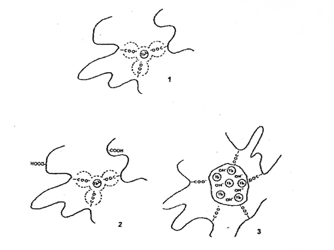 Figura 1- Modelos limites das ligações HPAM-Tb3+ propostos por Rodrigues e Galembeck: 1 e 2  Ligação direta COO- - Tb3+ para CFA40 e CFA50 em meio ácido. 3 - Ligação feita por adsorção da HPAM nas partículas coloidais de Hidróxidos de térbio para géis de CFN20, CFA40 e CFA50 com Tb3+ obtidos em meio básico.
